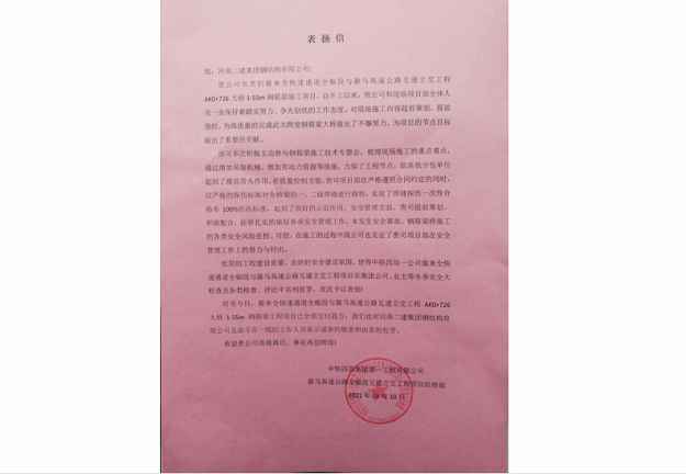 中铁四局集团第一工程有限公司向MK·体育-MK(中国)一站式服务官方网站发来表扬信